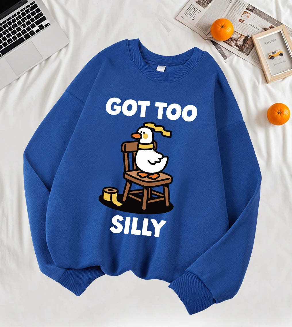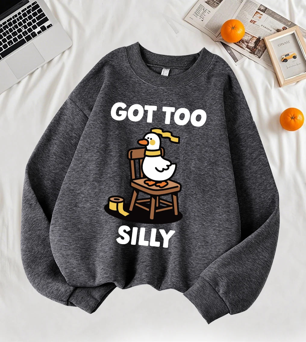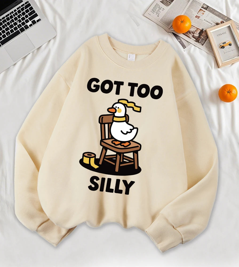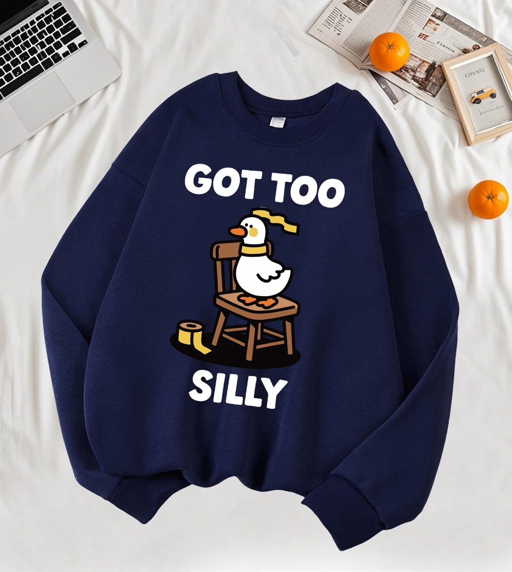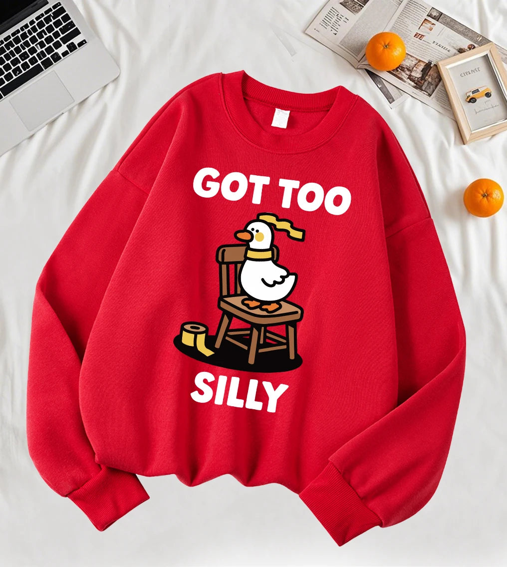 Get comfy, get silly — grab your “Got Too Silly” goose sweatshirt and waddle into cozy, meme-worthy style!