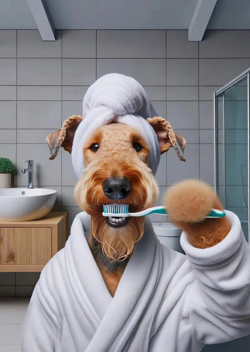 Features cute Beagle and Schnauzer characters in bathrobes brushing their teeth
