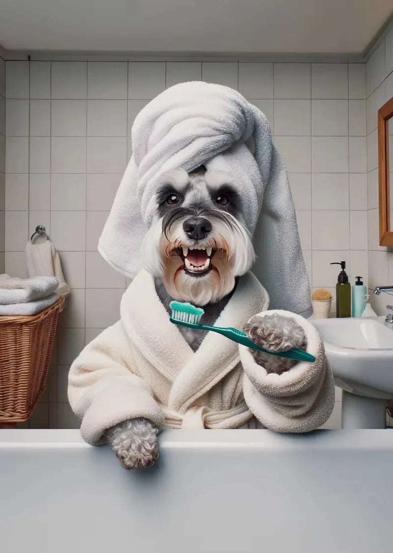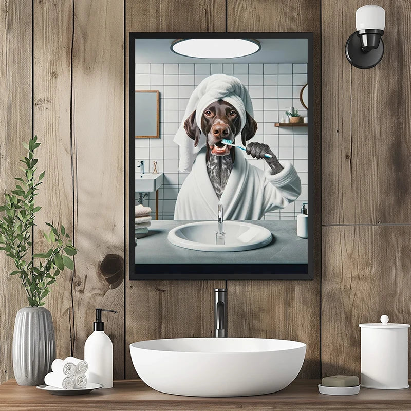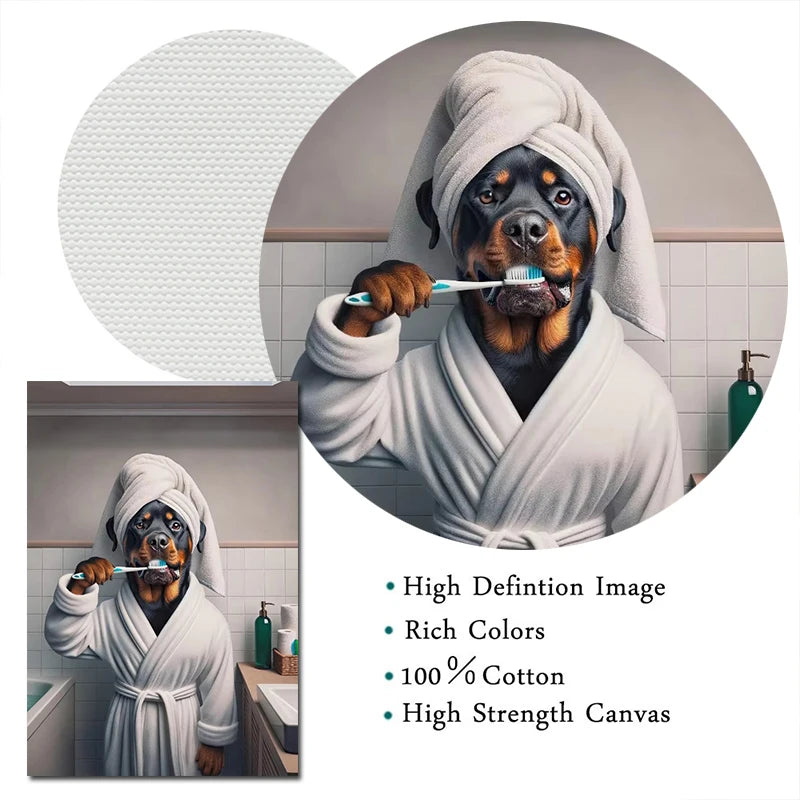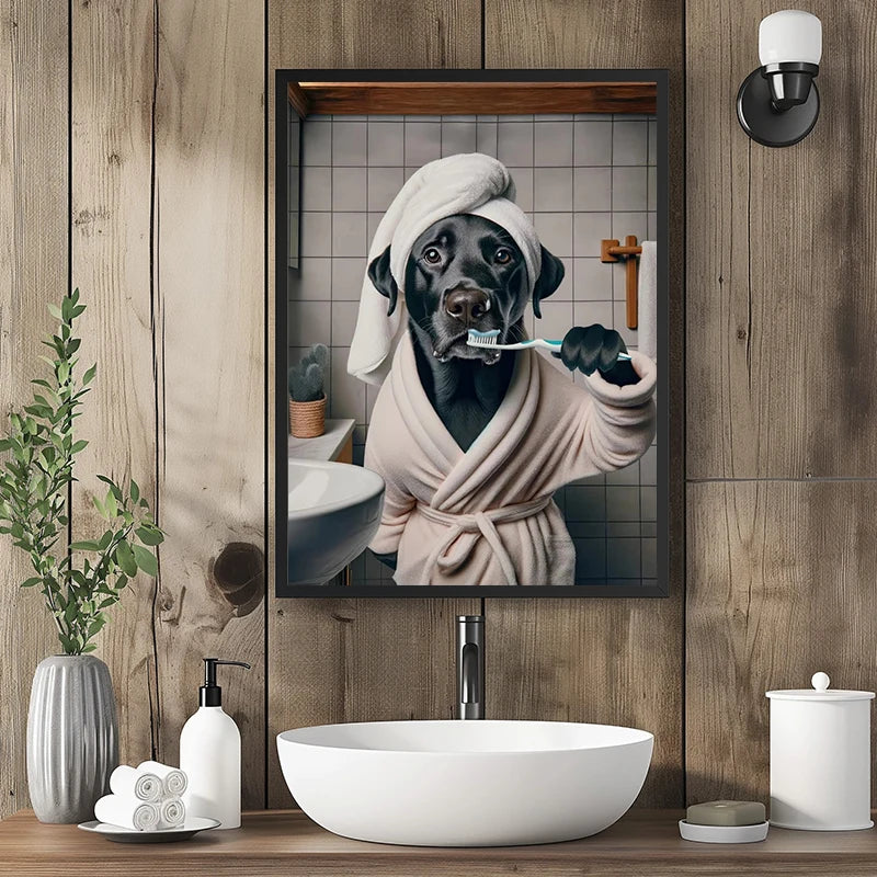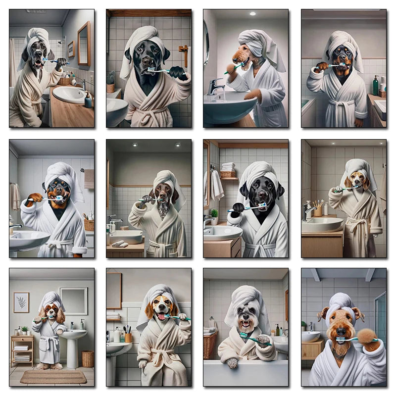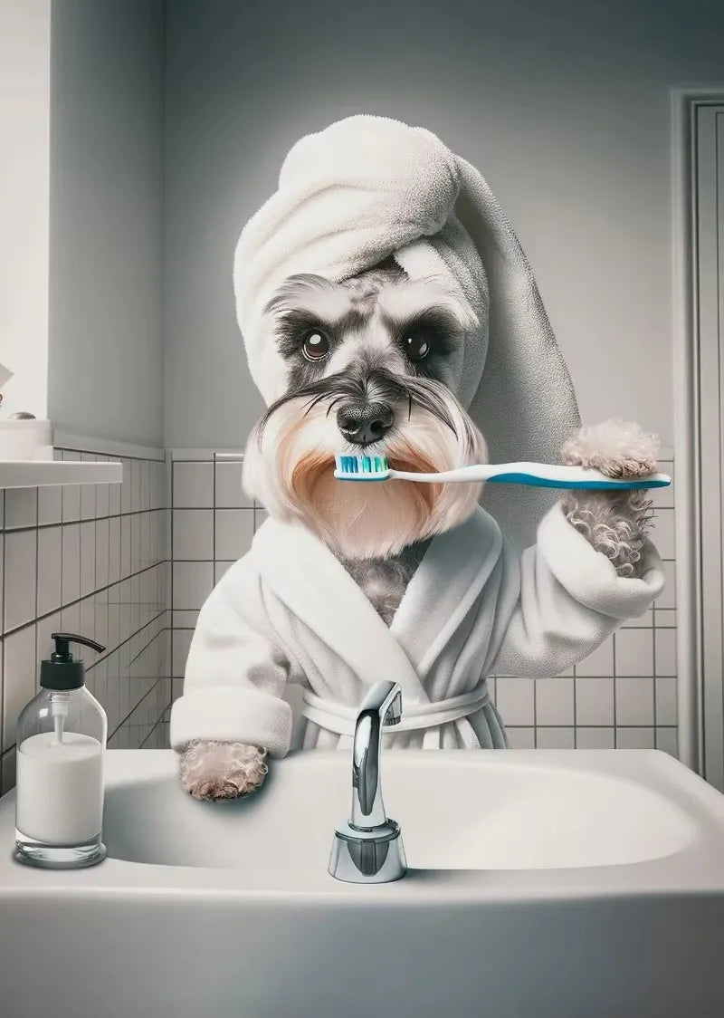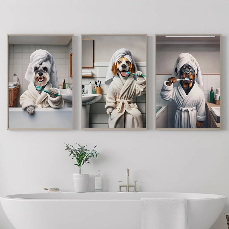 Add a splash of humor and charm to your space with this quirky canvas print featuring adorable Beagle and Schnauzer dogs brushing their teeth in cozy bathrobes — perfect for pet lovers and modern home décor!