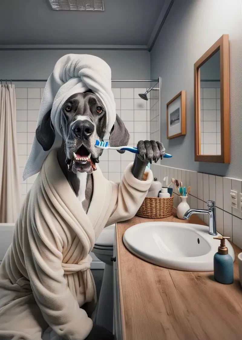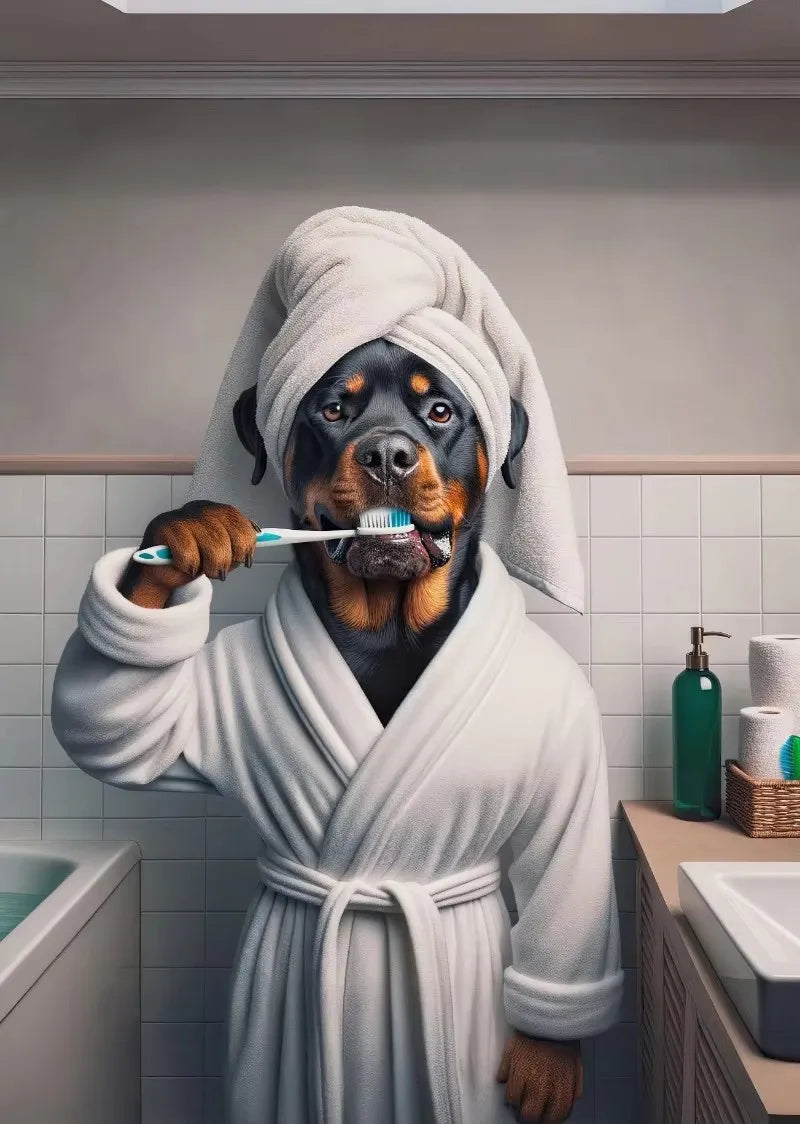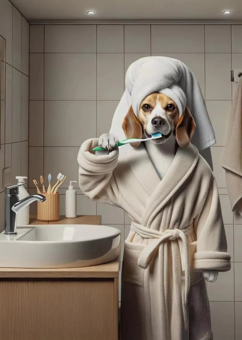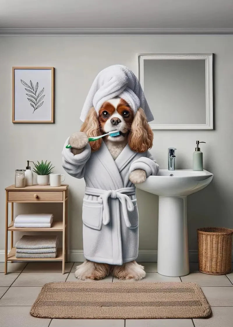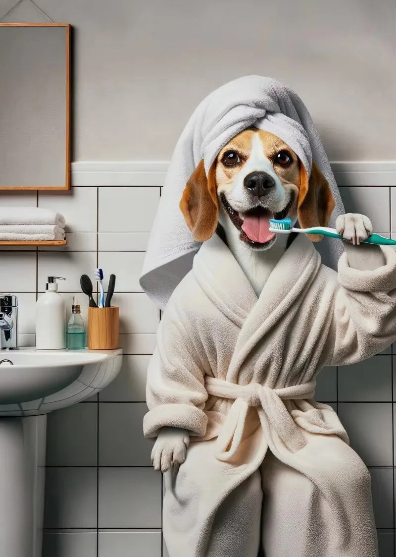 Add a splash of humor and charm to your space with this quirky canvas print featuring adorable Beagle and Schnauzer dogs brushing their teeth in cozy bathrobes — perfect for pet lovers and modern home décor!