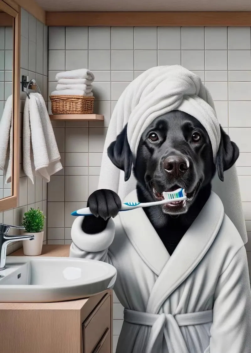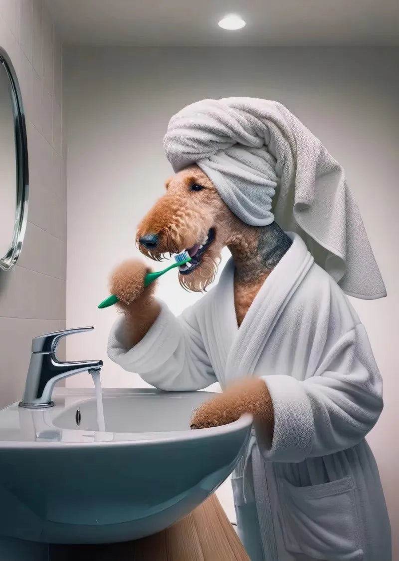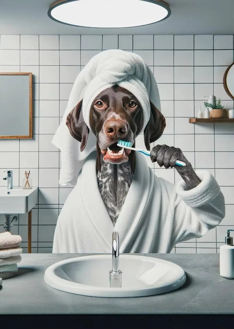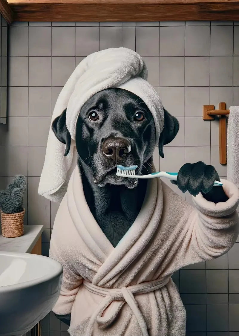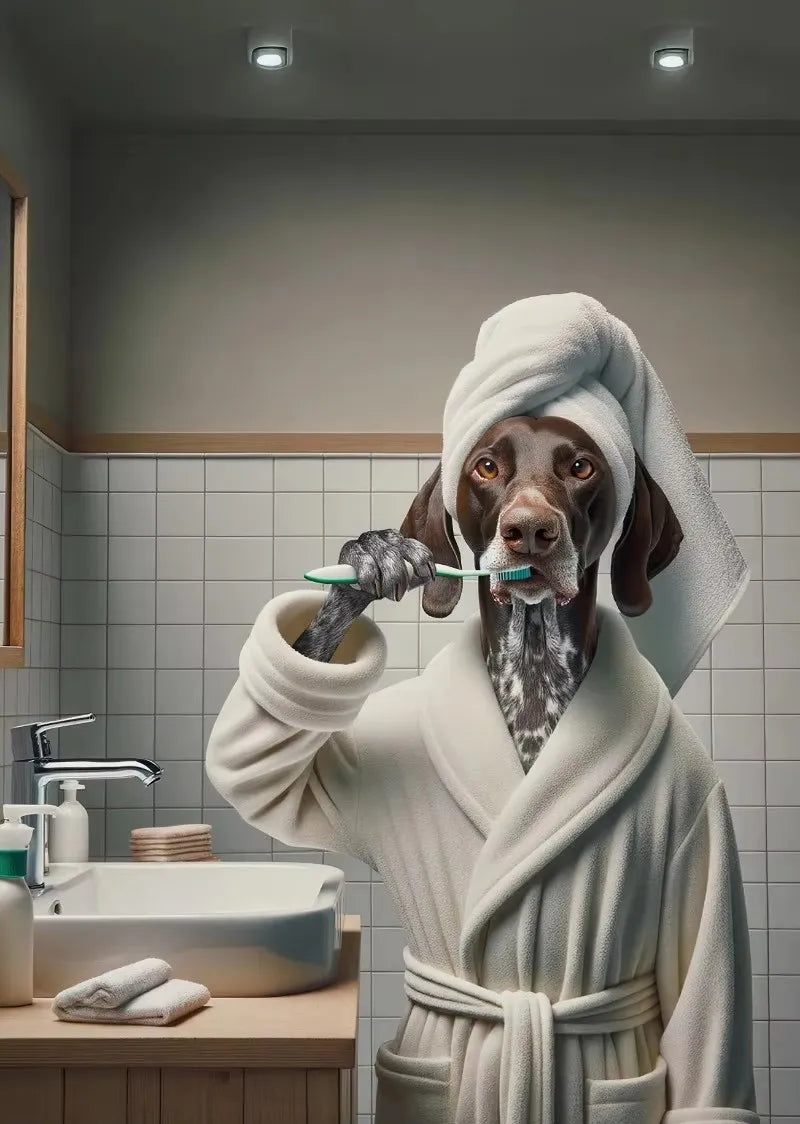 Add a splash of humor and charm to your space with this quirky canvas print featuring adorable Beagle and Schnauzer dogs brushing their teeth in cozy bathrobes — perfect for pet lovers and modern home décor!