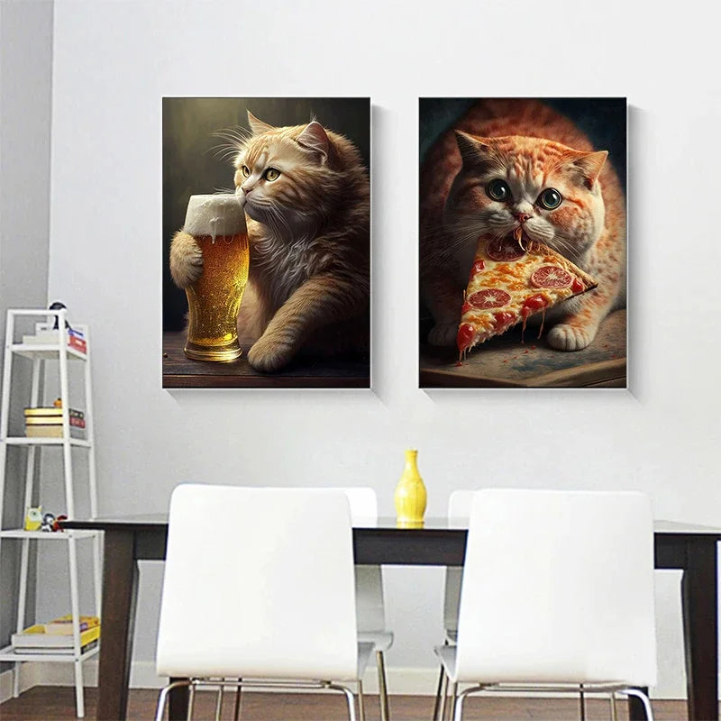 Drinking Funny Cat Posters – Beer & Pizza Meme Canvas Wall Art for Home & Cafe Decor