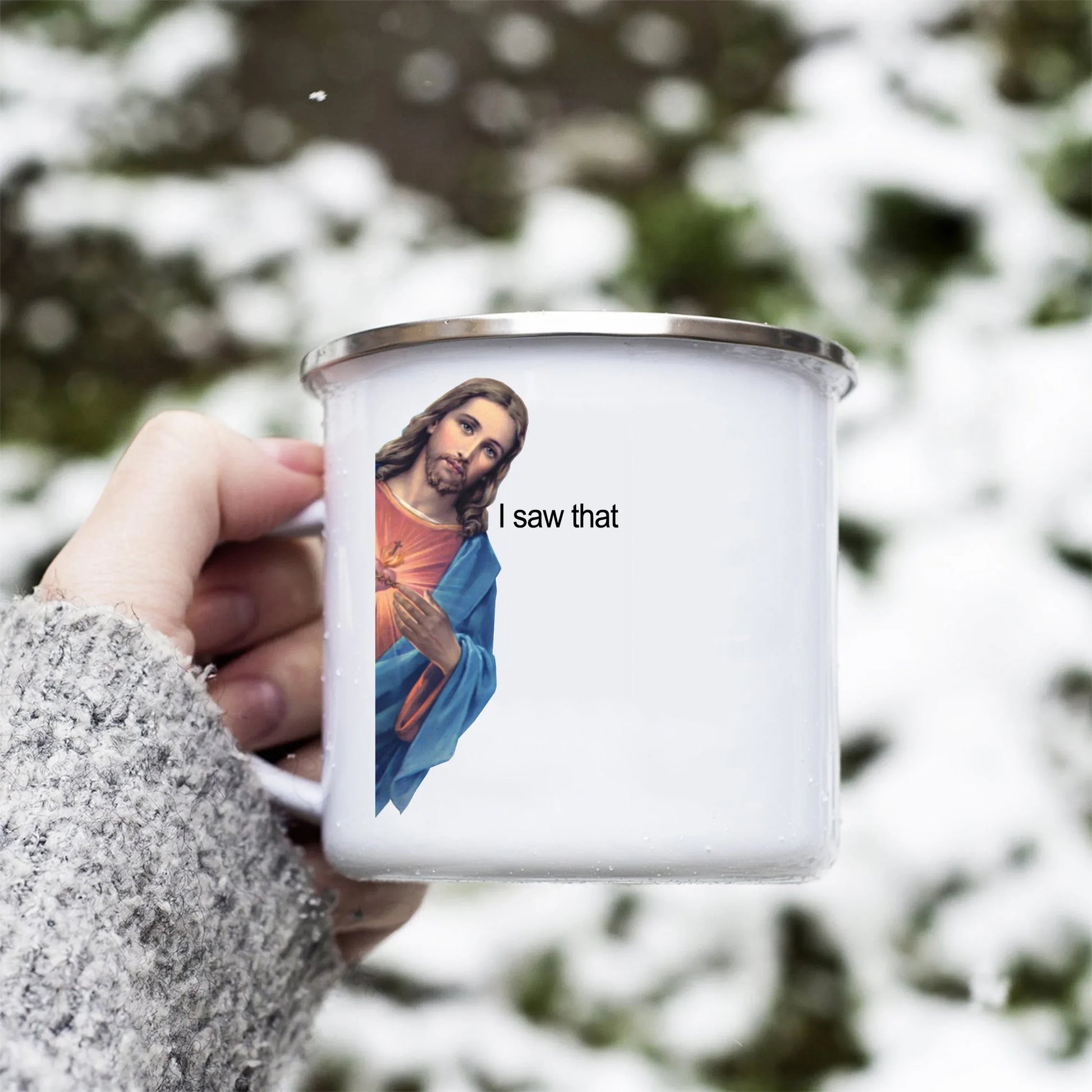 Enamel Mug Coffee Cup – Funny Jesus Meme Quote “I Saw That”