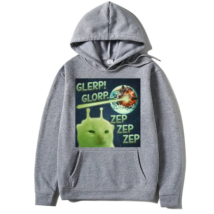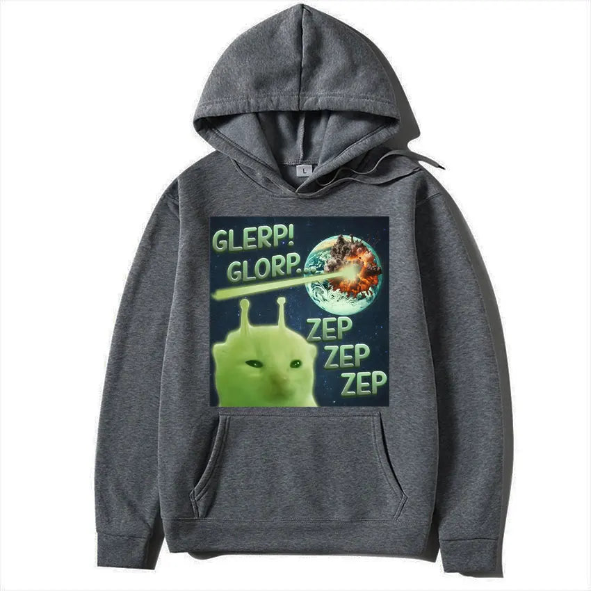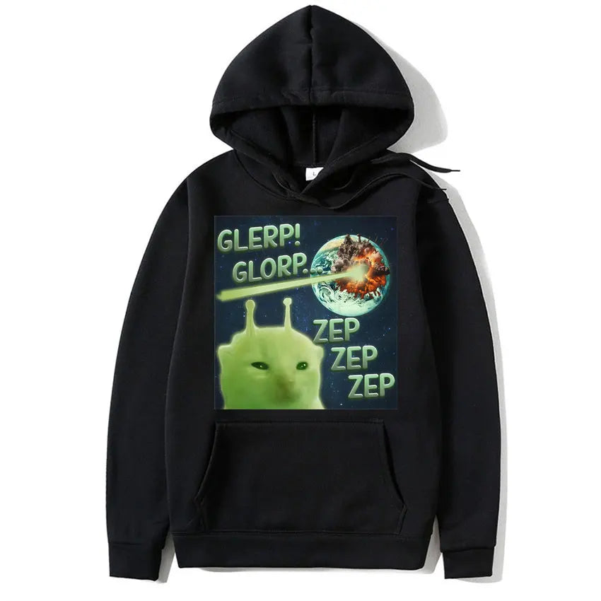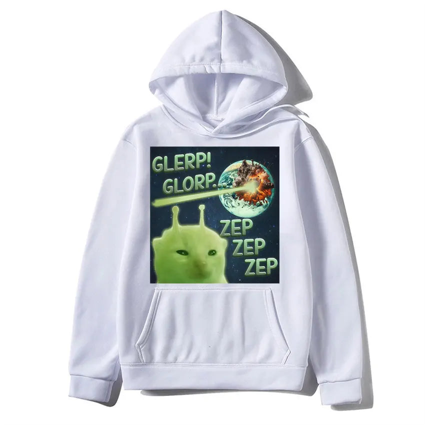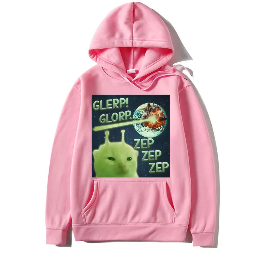 Get cozy and quirky with the Funny Alien Cat Glerp Glorp sweatshirt! This oversized Harajuku-style hoodie blends meme culture with street fashion, perfect for men and women who love bold, playful looks.