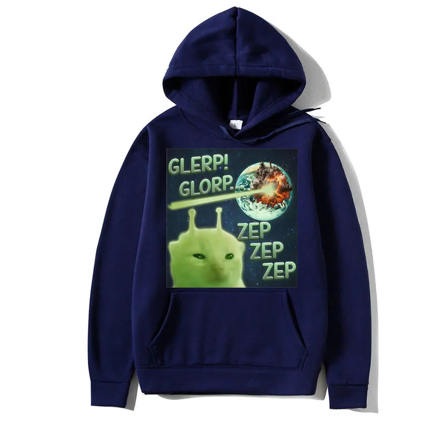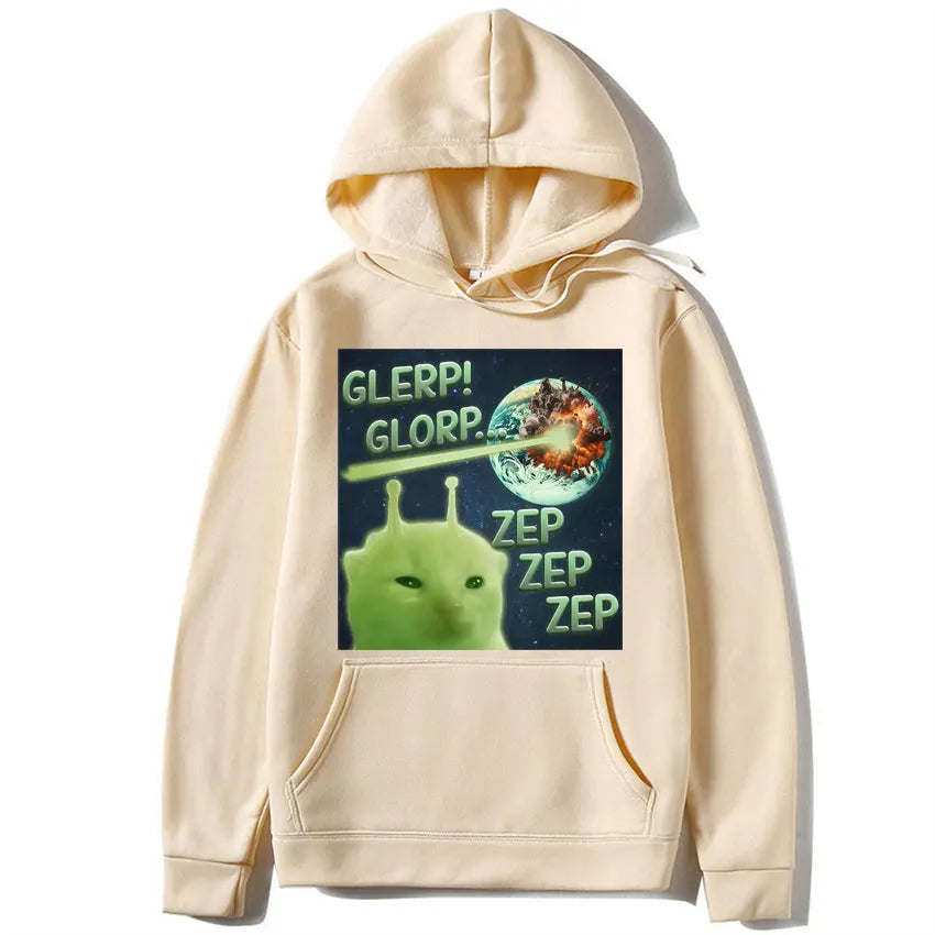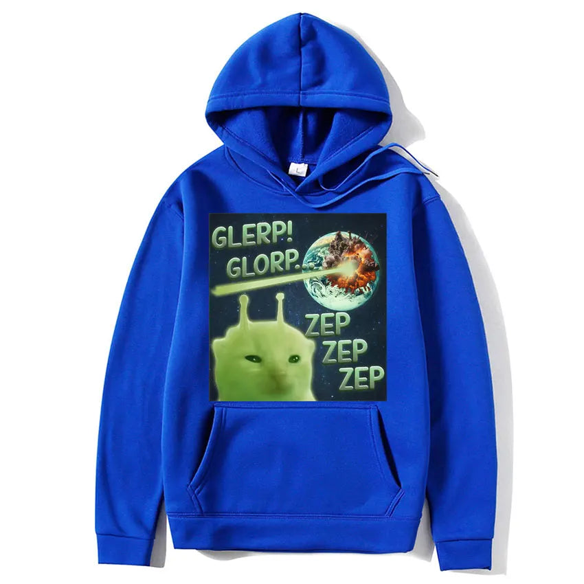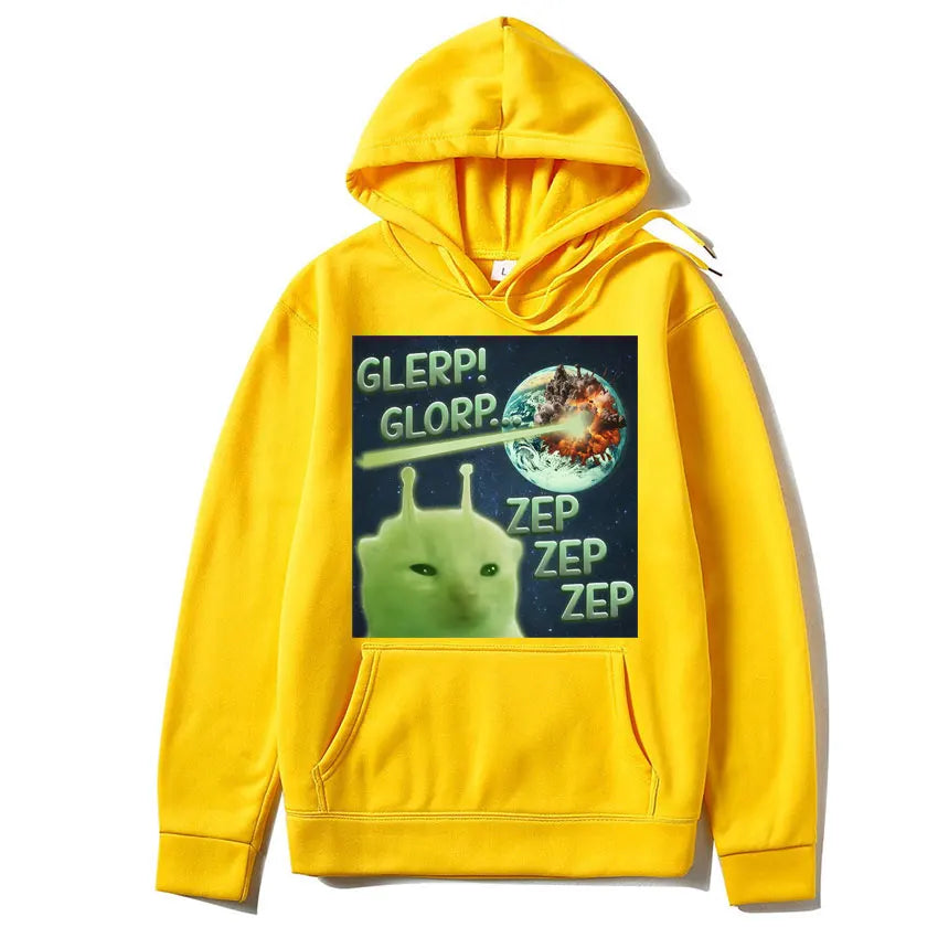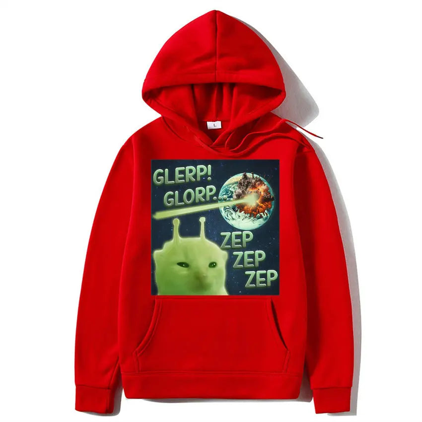 Get cozy and quirky with the Funny Alien Cat Glerp Glorp sweatshirt! This oversized Harajuku-style hoodie blends meme culture with street fashion, perfect for men and women who love bold, playful looks.