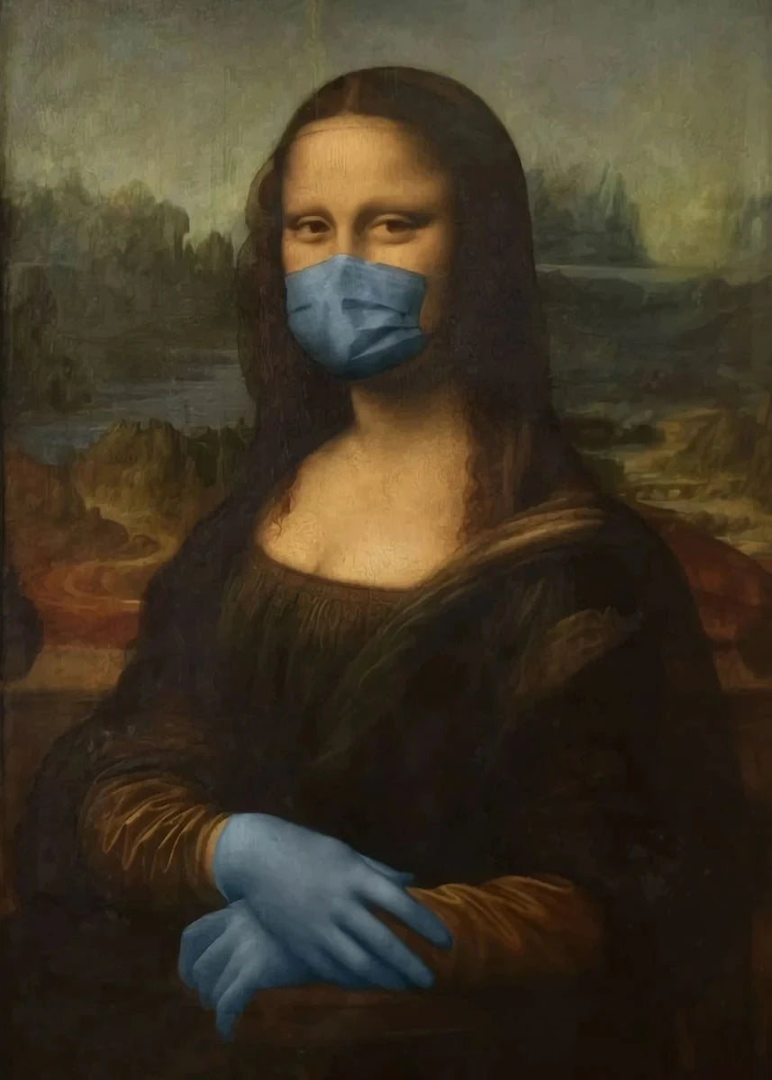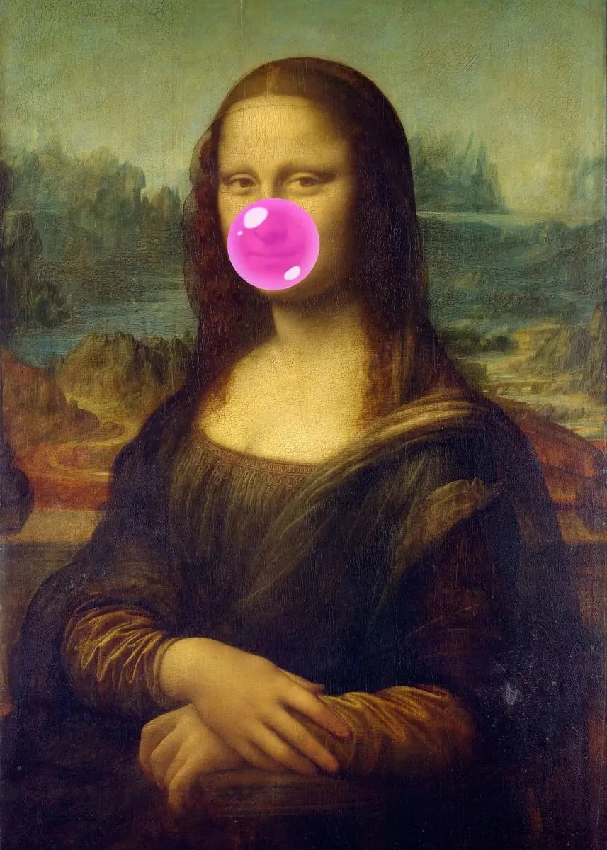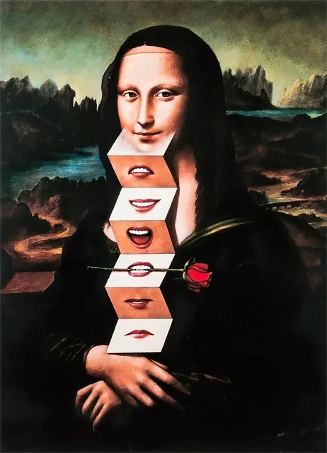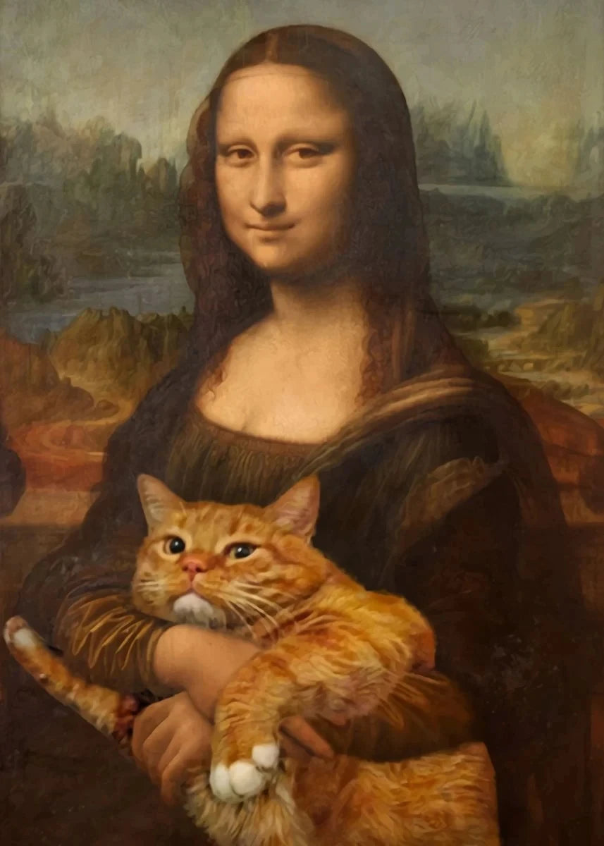 Features a whimsical reimagining of the Mona Lisa holding a cat
