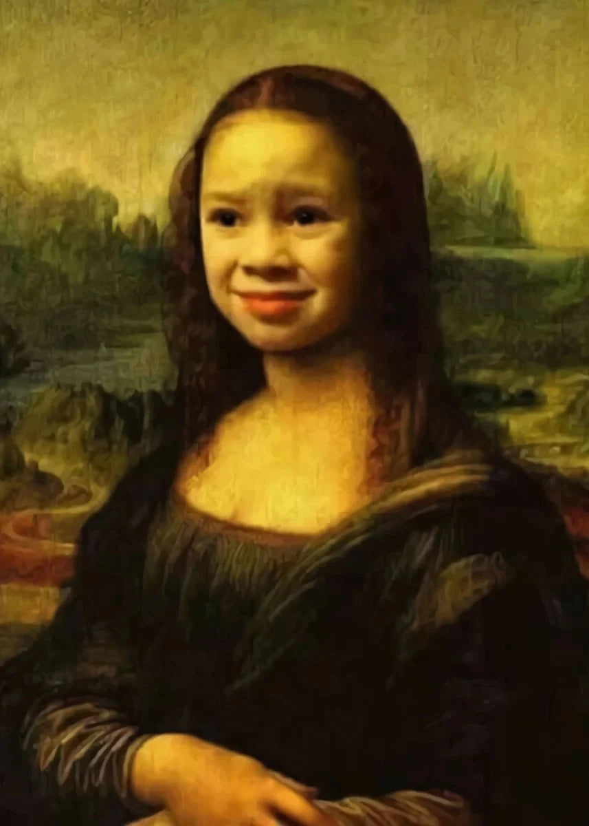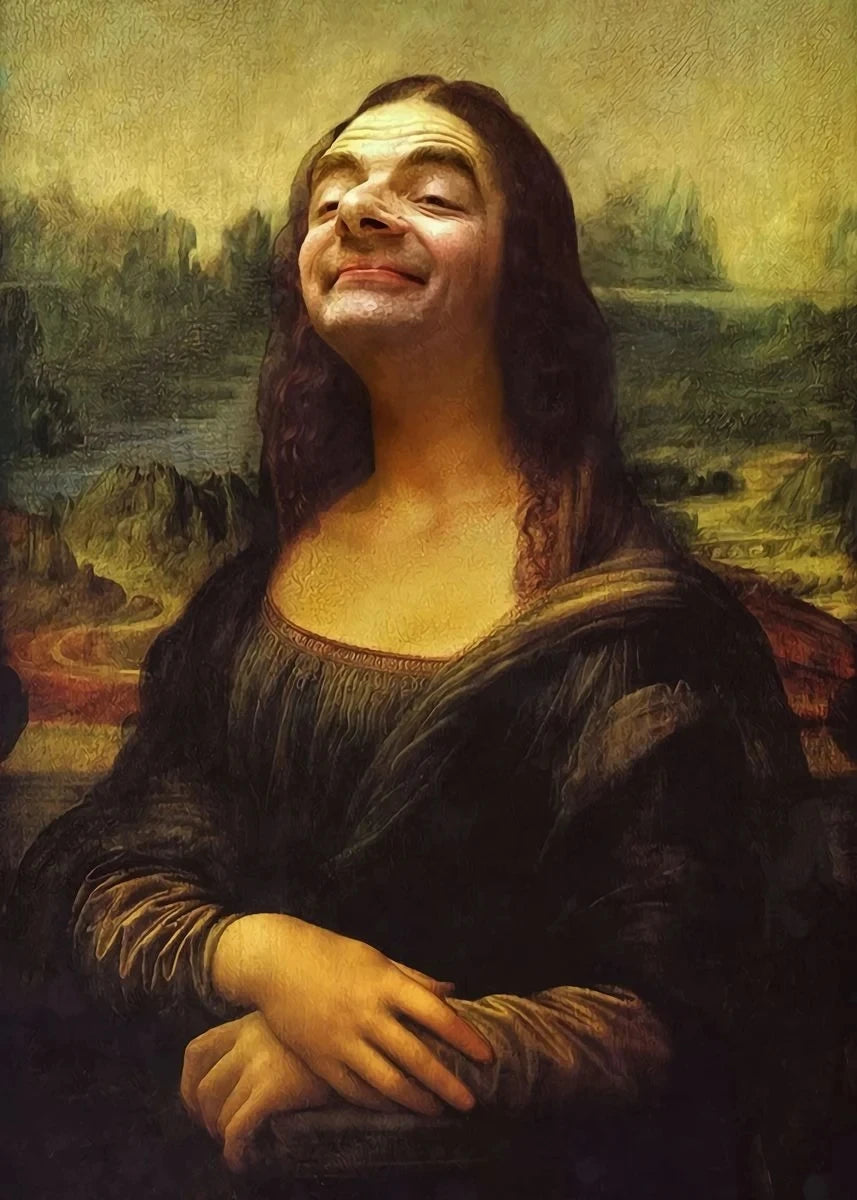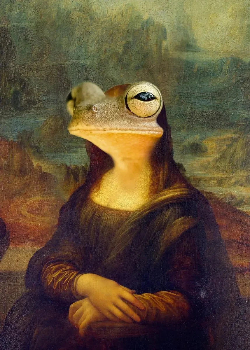Features a whimsical reimagining of the Mona Lisa holding a cat