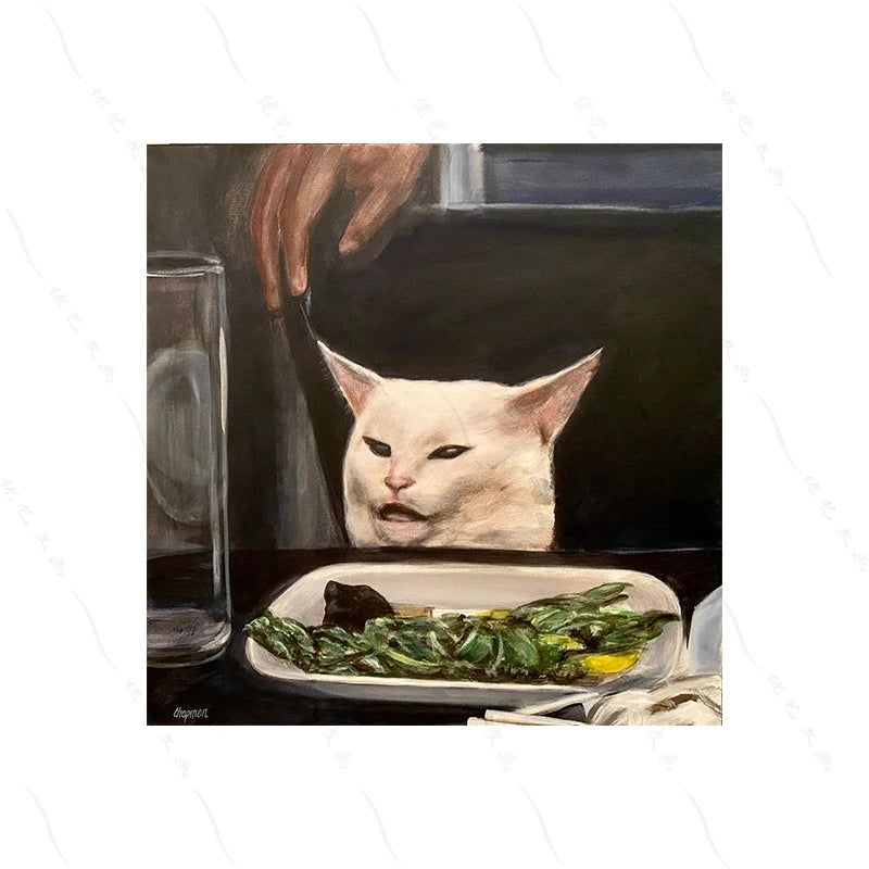 • Includes both parts of the famous meme: yelling woman & confused cat at dinner