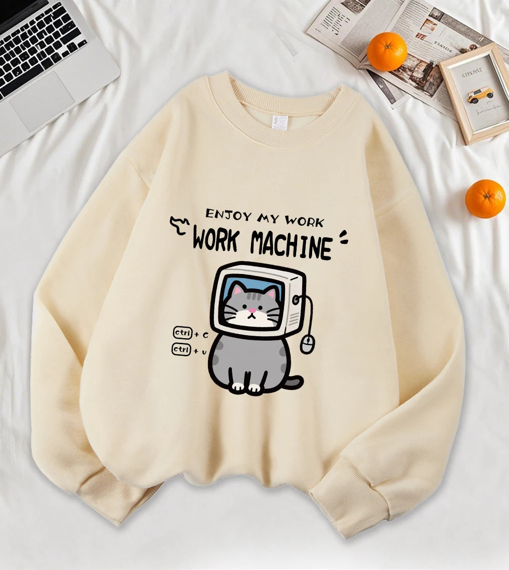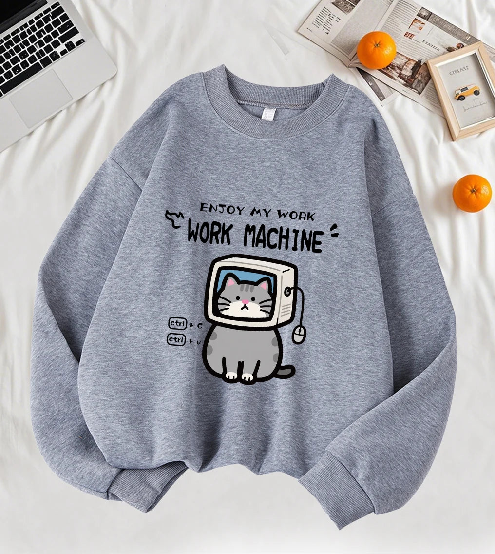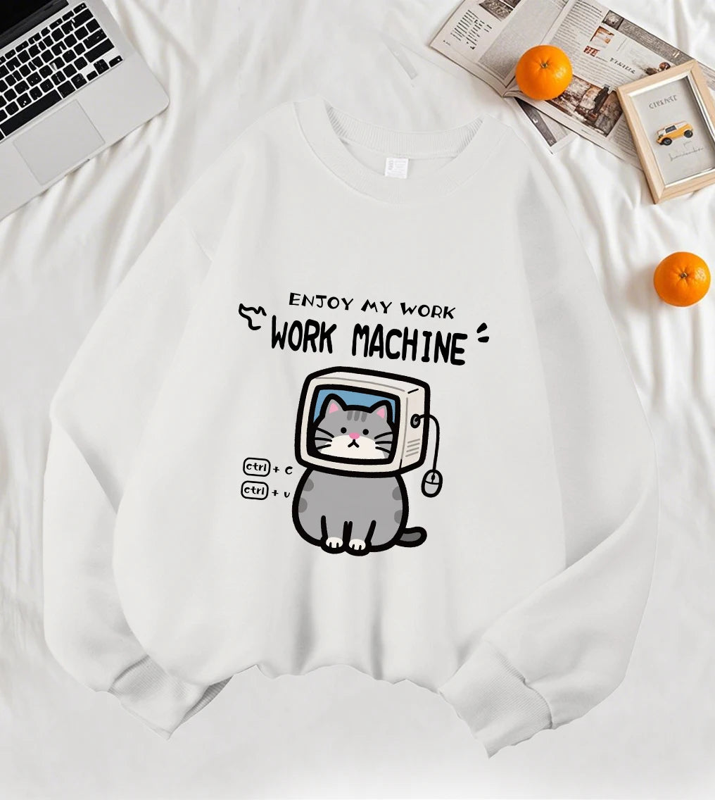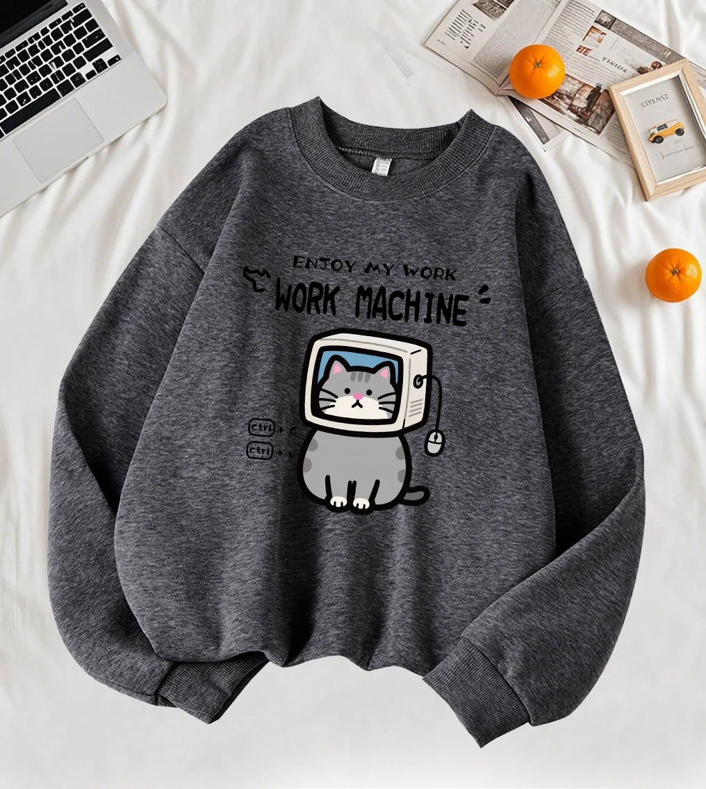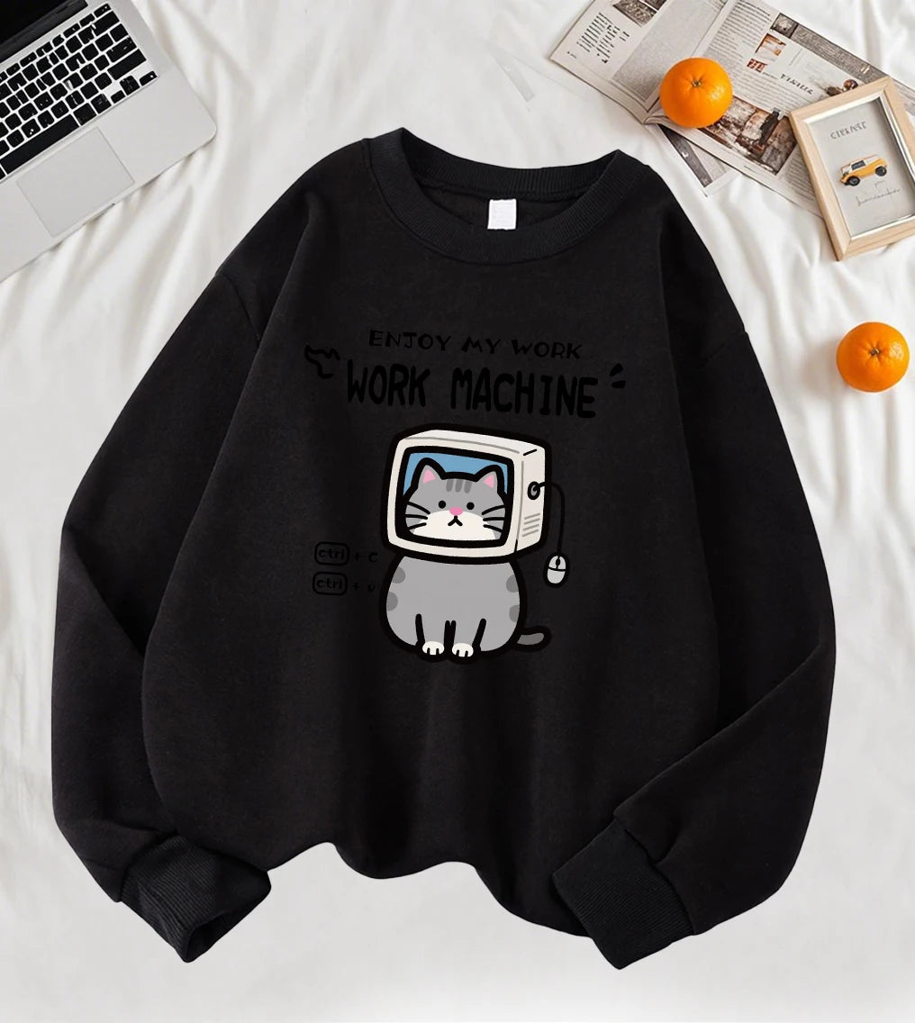"Work Machine Enjoy My Work" Cat Print Sweatshirt – Y2K Fleece Pullover for Women