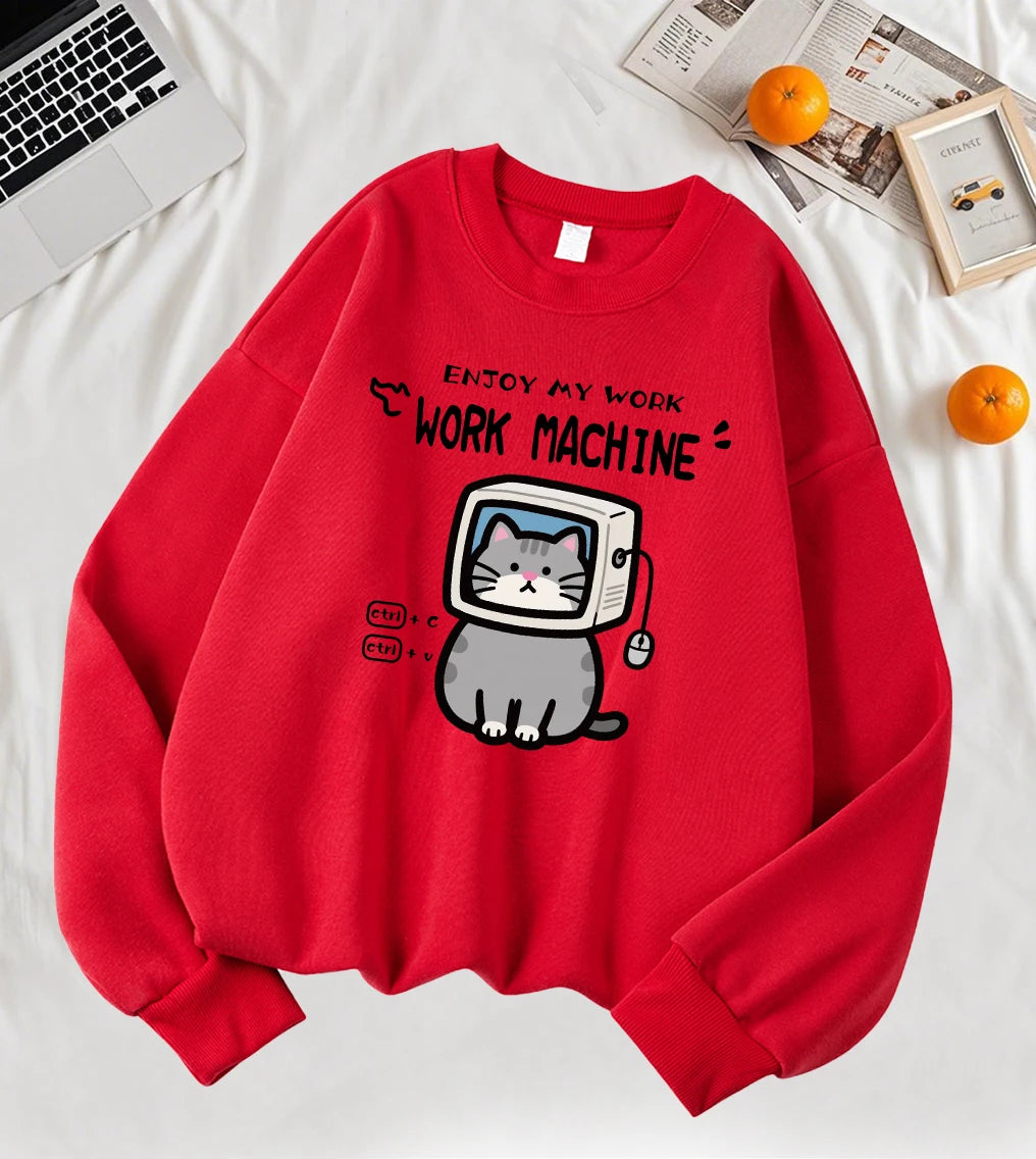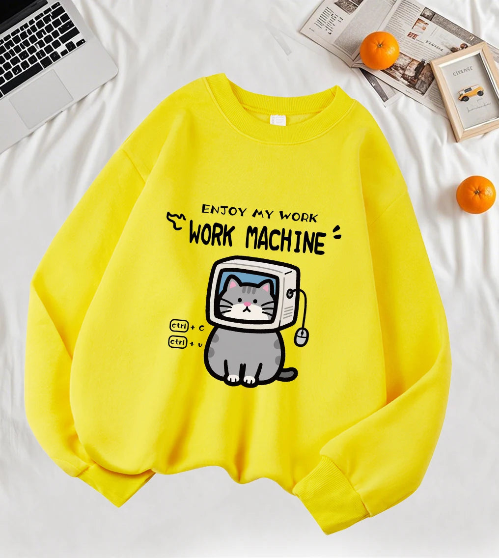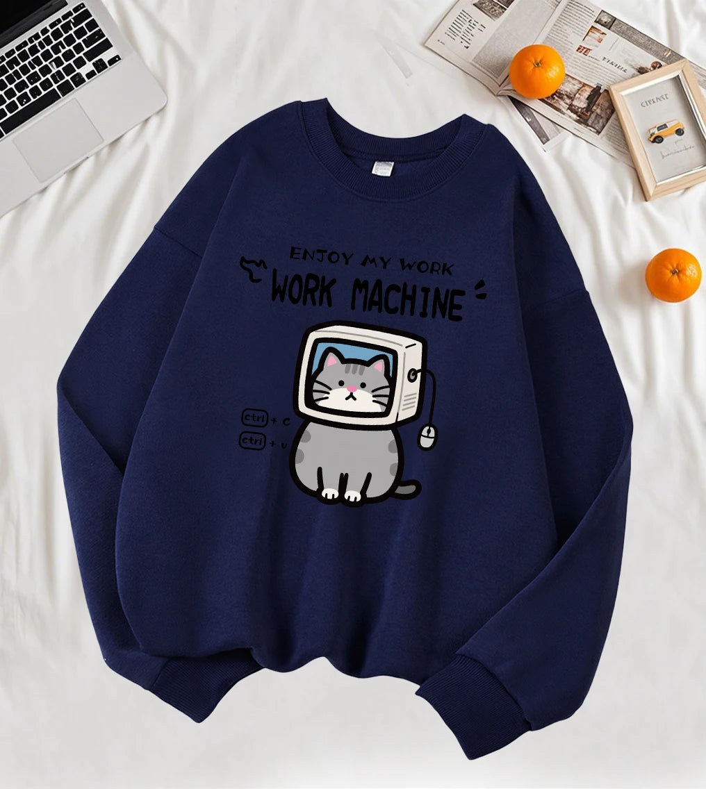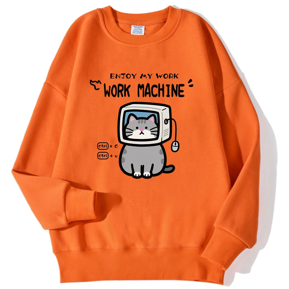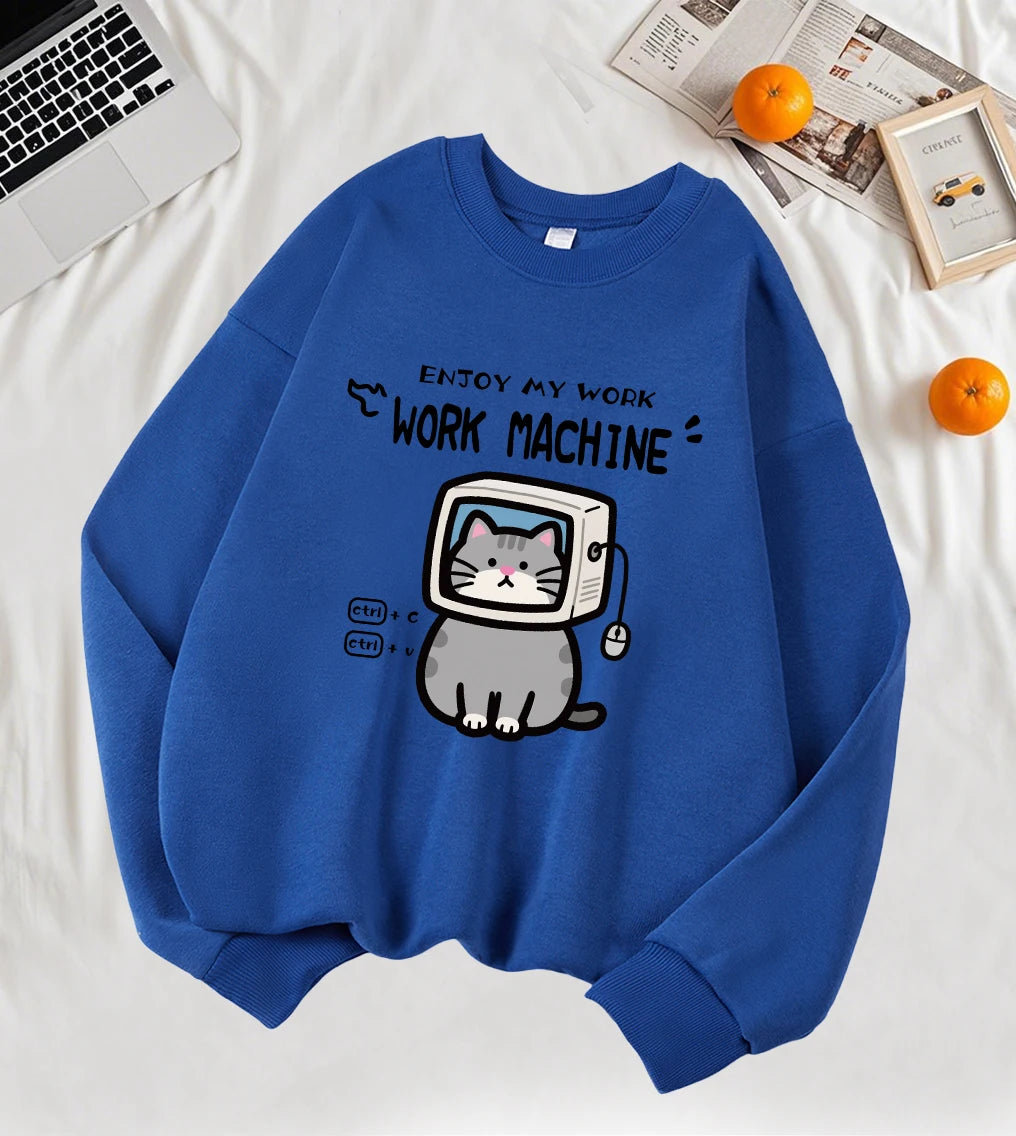 "Work Machine Enjoy My Work" Cat Print Sweatshirt – Y2K Fleece Pullover for Women